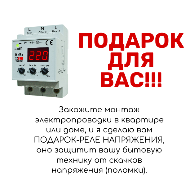 При заказе большого объёма работ я сделаю вам подарок: реле напряжения и бесплатно его установим. Это защитит вашу бытовую технику от скачков напряжения и обрыва нулевого проводника.